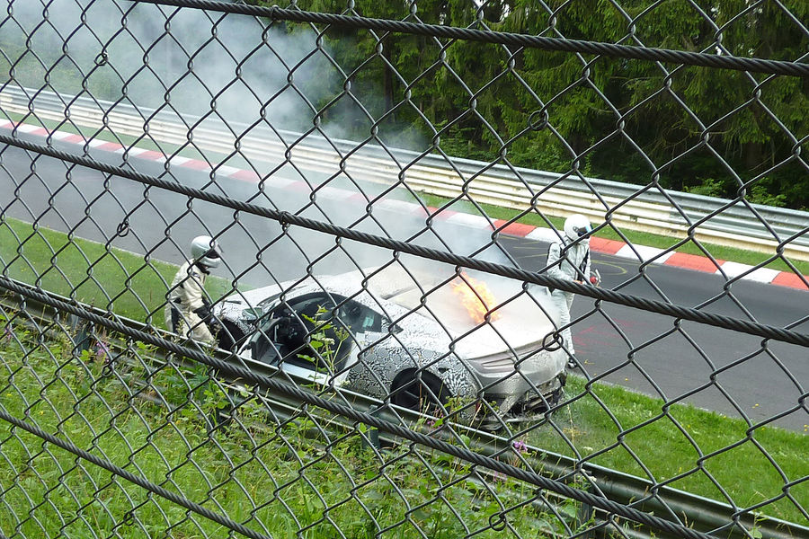 La session finale qui avait lieu hier sur le Nürb’ ne s’est pas déroulée comme prévu puisqu’au bout de quelques tours de piste, la voiture s’est embrasée par le biais du moteur, avant de gagner tout le reste du véhicule. Fort heureusement les deux occupants ont pu se ranger sur le bas-côté afin de s’extraire au plus vite (et par conséquent assister en première loge à ce triste spectacle).