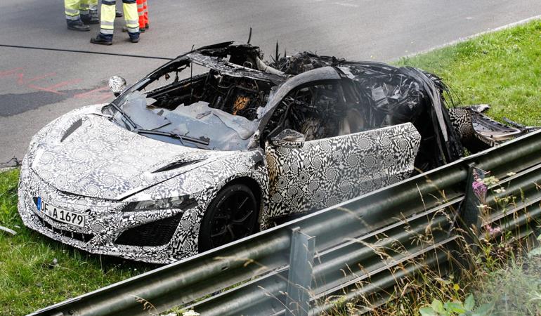 En phase terminale de sa période de développement, le prototype de la Honda NSX II a malheureusement eu le droit à son dernier baptême du feu (c’est le cas de le dire). En effet, c’est l’année prochaine que la NSX doit enfin voir le jour et être commercialisée, mais visiblement il reste encore quelques détails techniques à parfaire si Honda ne veut pas subir les mêmes mésaventures que Porsche avec sa 911 GT3.
