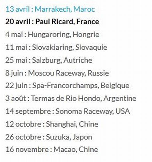 Le calendrier WTCC parcourra les 5 continents au travers de 12 courses dont la Chine, le Maroc, la Russie. Il fera également une escale en France pendant le week-end de Pâques sur le circuit du Castellet.