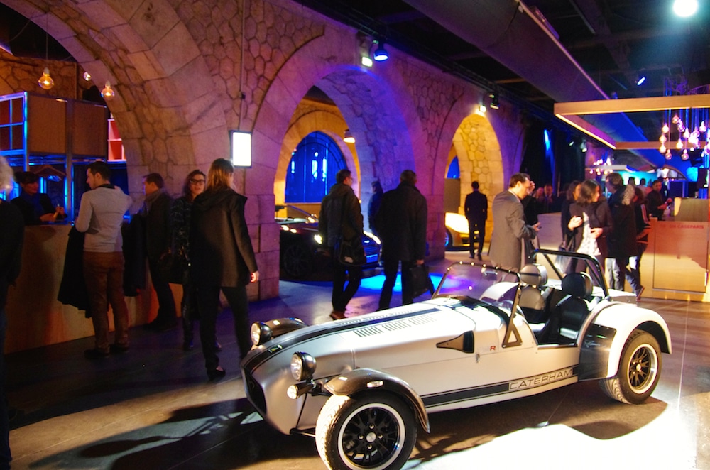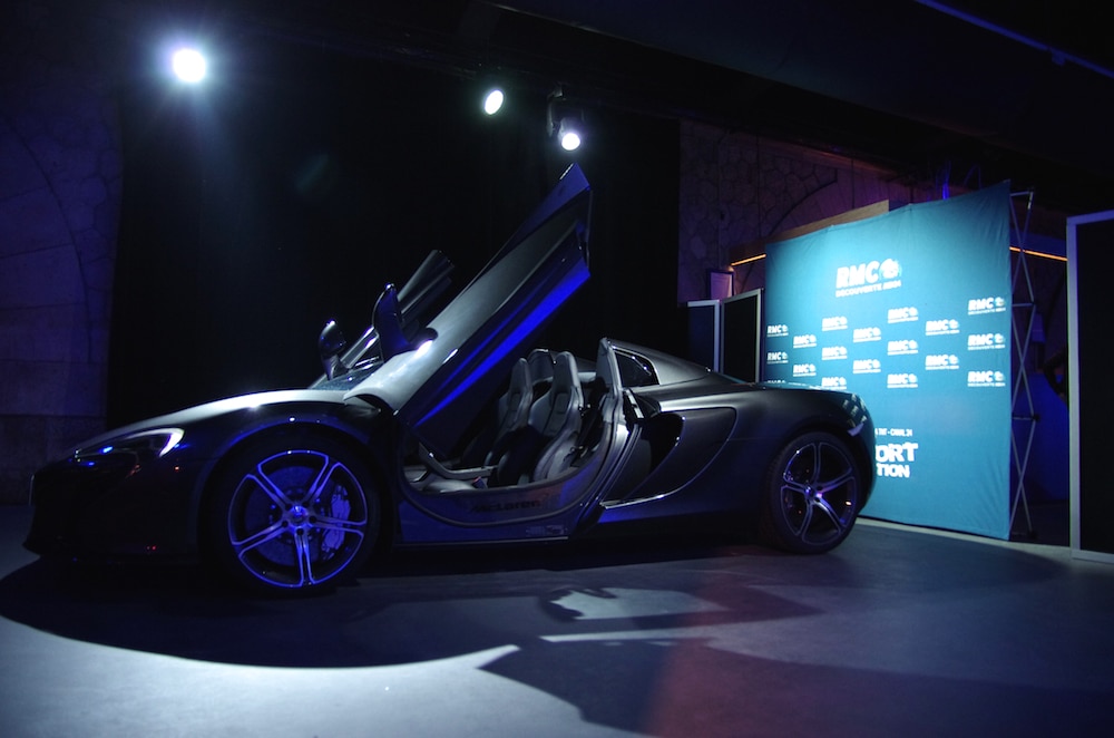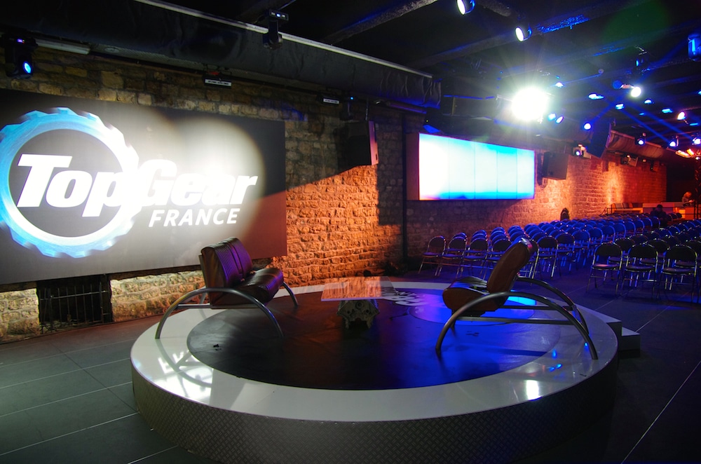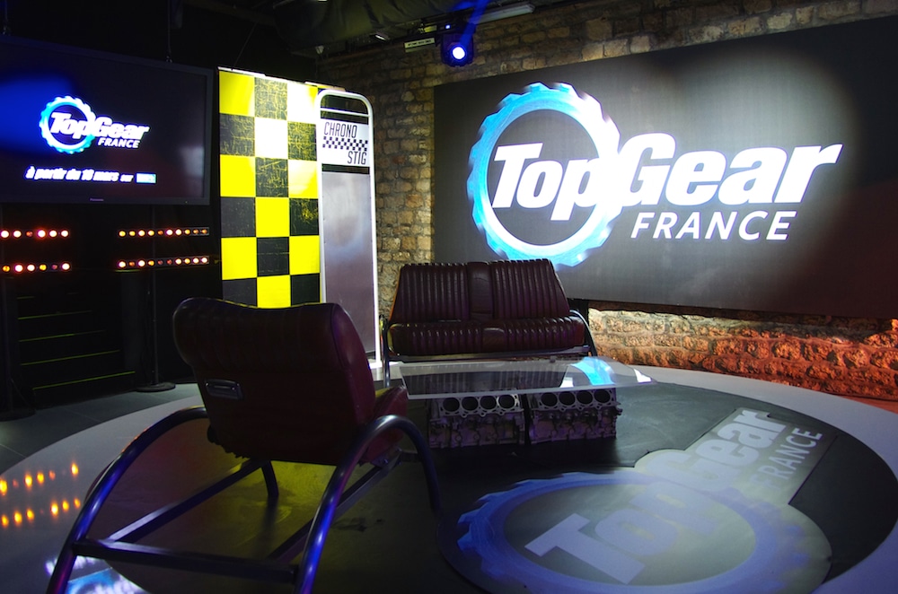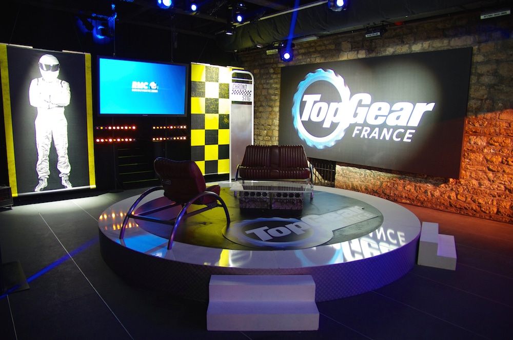 La conférence de presse se passe dans un haut lieu des nuits parisiennes, Le Show Case, sous le pont Alexandre III. Plutôt agréable comme environnement. Nous sommes accueillis dès l’extérieur par une Mercedes classe G et une Nissan GTR… Le ton est donné. En pénétrant on découvre une jolie petite Caterham, puis une Aston Martin, une BMW cab’ et enfin une McLaren 650s. Nous voilà donc plongés immédiatement dans un univers automobile, disons, sportif ! Et au détour de la salle suivante une reconstitution en version concentré du plateau de Top Gear. Nous y voilà donc, le plateau rond, la photo du Stig en pied, tout de blanc vêtu, les gros fauteuils en cuir et tout le décorum que l’on connait bien sur la version anglaise. D’ailleurs Philippe Lelouche nous précise, lors de l’exercice des questions-réponses aux journalistes, que tout ceci est très “charté” et qu’il est de l’intérêt de la version française de reprendre les recettes qui marchent de la version anglaise.
