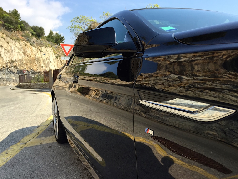 Premier contact, la bête est imposante ! Cinq mètres de long pour 1,90 mètre de large ! ça s’annonce serré sur les petites routes de l’arrière pays Niçois. Et je ne vous parle pas des deux tonnes de ce… Gran Coupé. Elle porte bien son nom finalement. Allez contact, enfin façon de parler, car cette BMW ne dispose plus de clé de contact. Un simple bip qui ne sert même plus car avec l’accès confort, plus besoin de biper, il suffit de saisir la poignée, clé en poche. Bon il est vrai que l’on peut retrouver cette fonction sur une simple citadine, mais ça fait toujours son effet ! Allez j’appuie sur le bouton Stop/Start et le 6 cylindres s’ébroue.