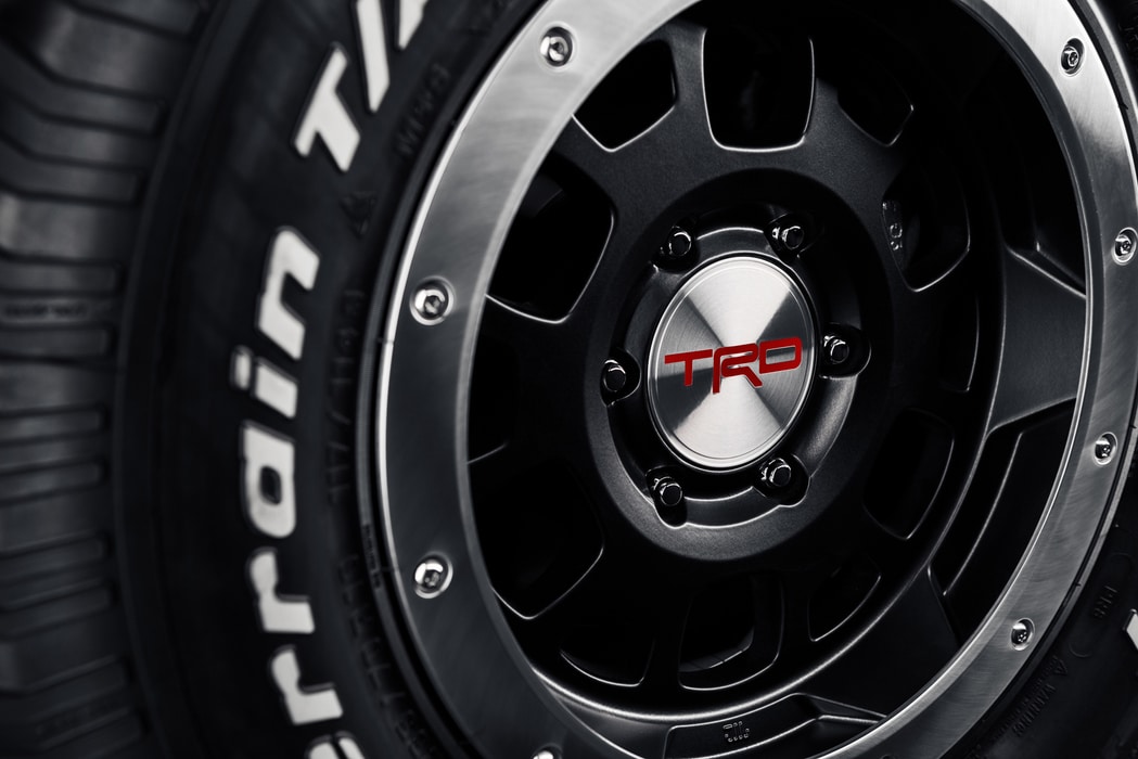 Cette nouvelle version se pare donc des mêmes attributs que son illustre aîné : robe noire, suspensions Off-Road, jantes TRD, pneus BFGoodrich, pare-chocs tubulaires, feux additionnels KC HiLites, et même bavettes.