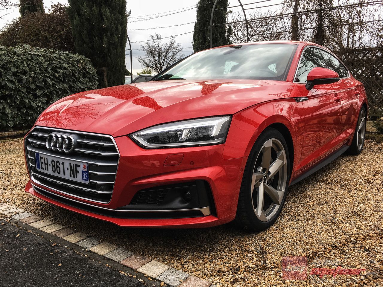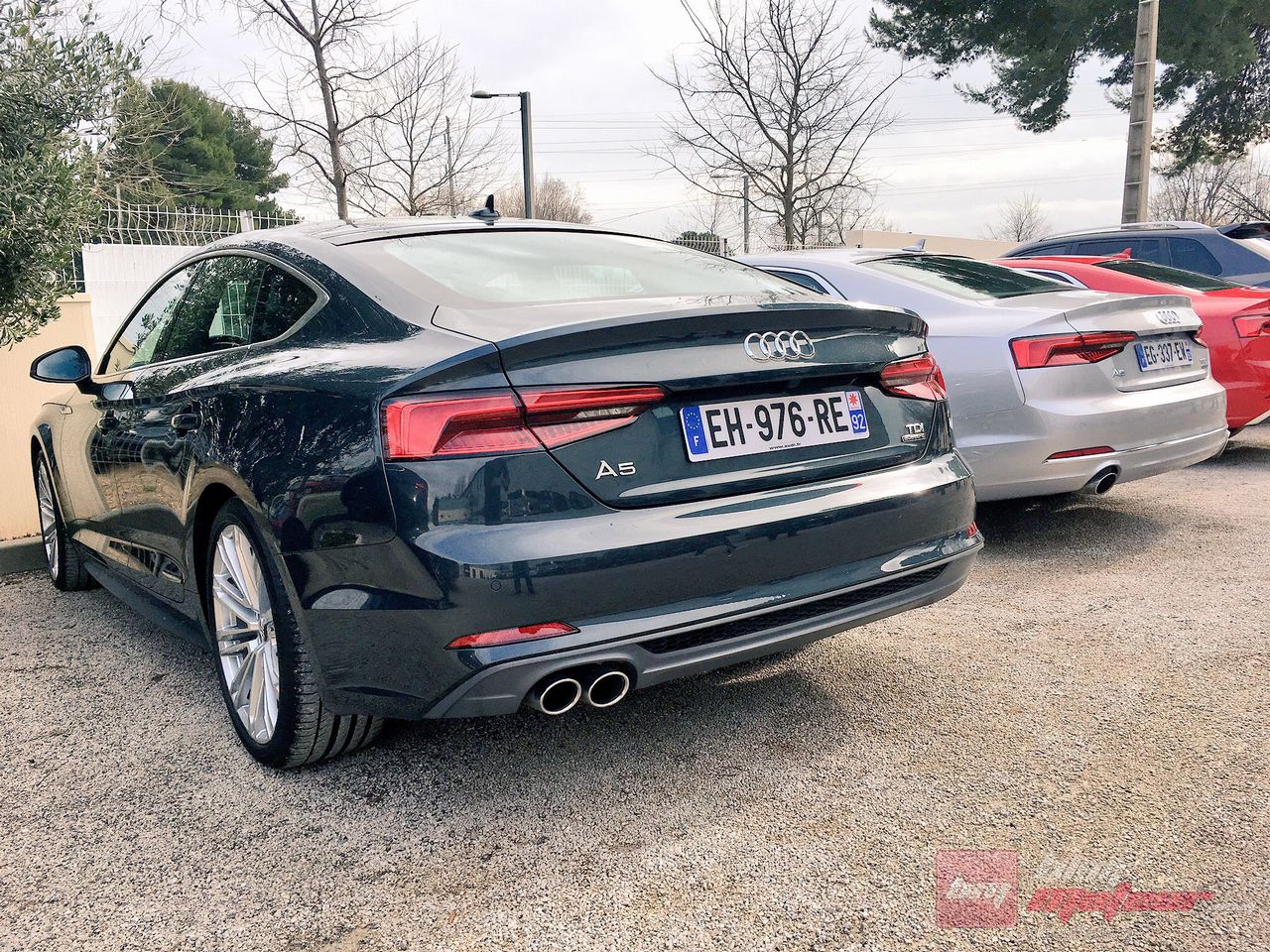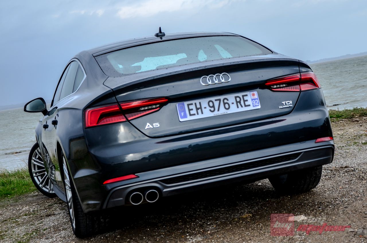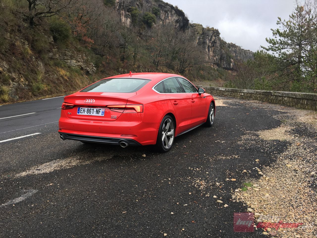 Lors de l’essai, j’ai eu le privilège d’essayer 3 modèles. Le TDI 190ch, le TFSI 252 ch et le V6 de 354 ch de la S5 !! Autant vous le dire tout de suite, le 2.0 TDI de 190 chevaux, ne m’a pas vraiment séduit. Pour être franc, je l’ai trouvé particulièrement limite sur l’Audi A5. Un peu perdu, aseptisé, le TDI 190 est à la peine. Sans doute une question de rapport poids puissance vis-à-vis de la berline qui affiche tout de même 1700 kg sur la balance. Même la très bonne boite DSG donne l’impression de ne pas savoir quel rapport engagé par moment. Si l’on veut rouler en TDI, comme 90% des acheteurs, mieux vaudrait s’orienter vers le V6 3.0 TDI, beaucoup plus noble et coupleux.