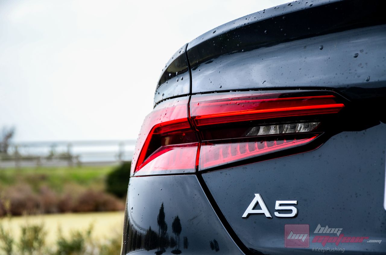 Cette chute de pavillon, ces feux à la fois racés et aguicheurs, nous avons devant nous le plus beau coup de crayon des berlines de la marque aux anneaux. Walter Da Silva, le designer à qui l’on doit l’Audi A5 l’a d’ailleurs avoué avant sa retraite, « c’est ma plus belle réalisation ». Que ce soit le coupé ou bien le sportback, l’Audi A5 surprend par ses formes beaucoup plus aguicheuses que le coup de crayon germanique, un brin austère que nous avons pour habitude de voir. Cette Audi A5 respire quelque chose de Latin. Des galbes, des rondeurs quelques arêtes bien choisies, cette ligne de flottaison aussi apaisante qu’une mer calme, non vraiment cette Audi A5 est particulièrement réussie.