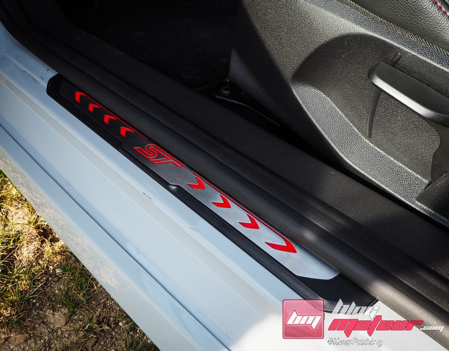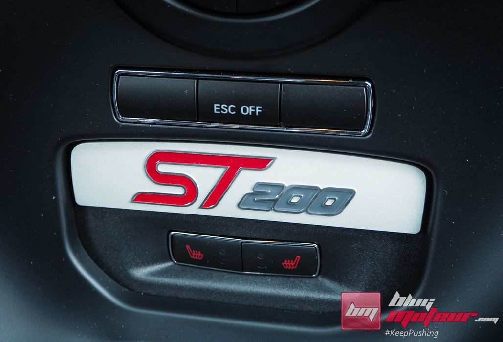 L’intérieur évolue lui aussi de façon très subtile : on note tout au plus les seuils de porte éclairés, les sièges Recaro avec surpiqûres argentées, et la plaque ST200 disposée sous la console centrale.