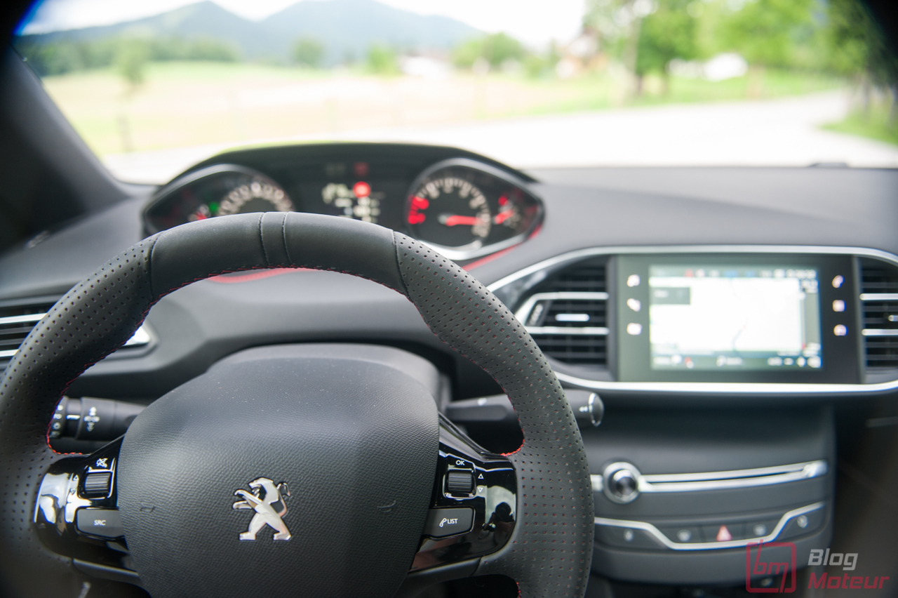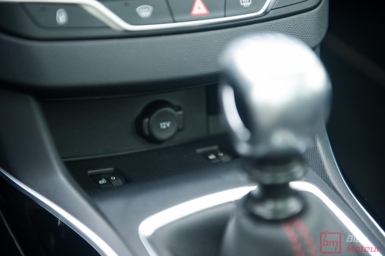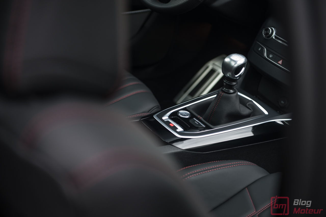 • Le diesel 2.0 L BlueHDi 180 S&S est dorénavant couplé à la boîte automatique EAT8 de nouvelle génération. Les chiffres annoncés sont alléchants : 180 ch et 400 N.m à 2000 tr/min, pour une masse très contenue de 1300 kg. Ici, on arrive au moins à la cheville des allemandes. La boite de vitesse s’avère très douce en utilisation quotidienne. En revanche, que ce soit de la part de la boite ou du moteur, la mécanique ne transpire pas la sportivité. Pourtant puissant et très docile, le 2.0 litres diesel se fait oublier par un châssis exceptionnel ! Les palettes au volant permettent de « jouer un peu », mais il manque encore quelques dixièmes de rapidité pour en faire une parfaite réussite. En somme, le conducteur sportif devra se pencher vers la GTi, pour un autre usage j’en conviens. La nouvelle commande électronique de sélection des modes est très agréable. Petite et ergonomique, elle aurait pu laisser place à quelques emplacements de rangements supplémentaires.