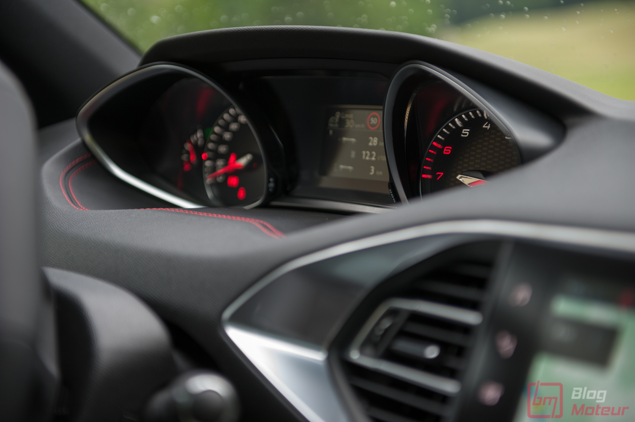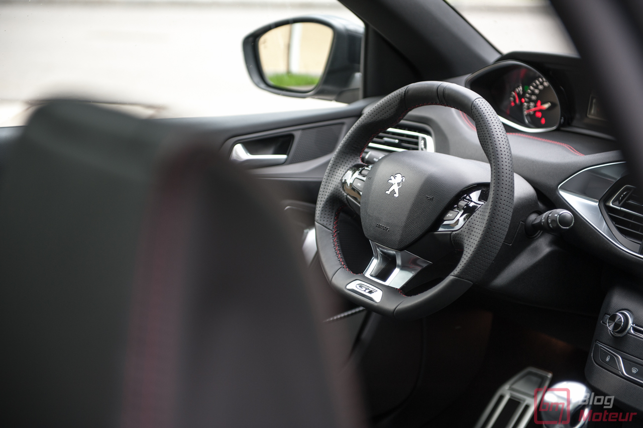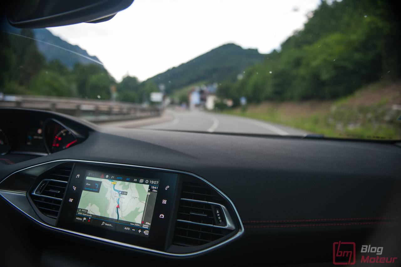 • Le diesel 2.0 L BlueHDi 180 S&S est dorénavant couplé à la boîte automatique EAT8 de nouvelle génération. Les chiffres annoncés sont alléchants : 180 ch et 400 N.m à 2000 tr/min, pour une masse très contenue de 1300 kg. Ici, on arrive au moins à la cheville des allemandes. La boite de vitesse s’avère très douce en utilisation quotidienne. En revanche, que ce soit de la part de la boite ou du moteur, la mécanique ne transpire pas la sportivité. Pourtant puissant et très docile, le 2.0 litres diesel se fait oublier par un châssis exceptionnel ! Les palettes au volant permettent de « jouer un peu », mais il manque encore quelques dixièmes de rapidité pour en faire une parfaite réussite. En somme, le conducteur sportif devra se pencher vers la GTi, pour un autre usage j’en conviens. La nouvelle commande électronique de sélection des modes est très agréable. Petite et ergonomique, elle aurait pu laisser place à quelques emplacements de rangements supplémentaires.