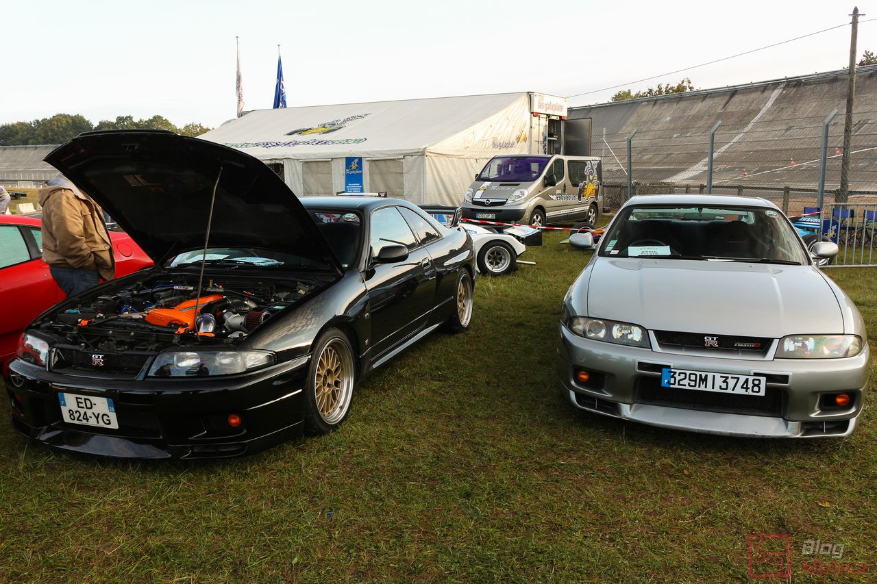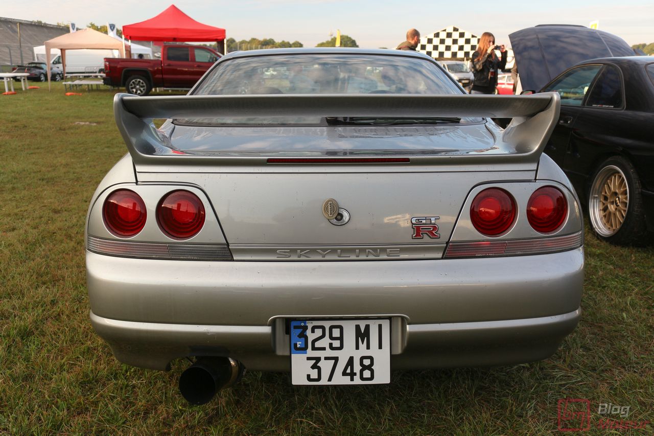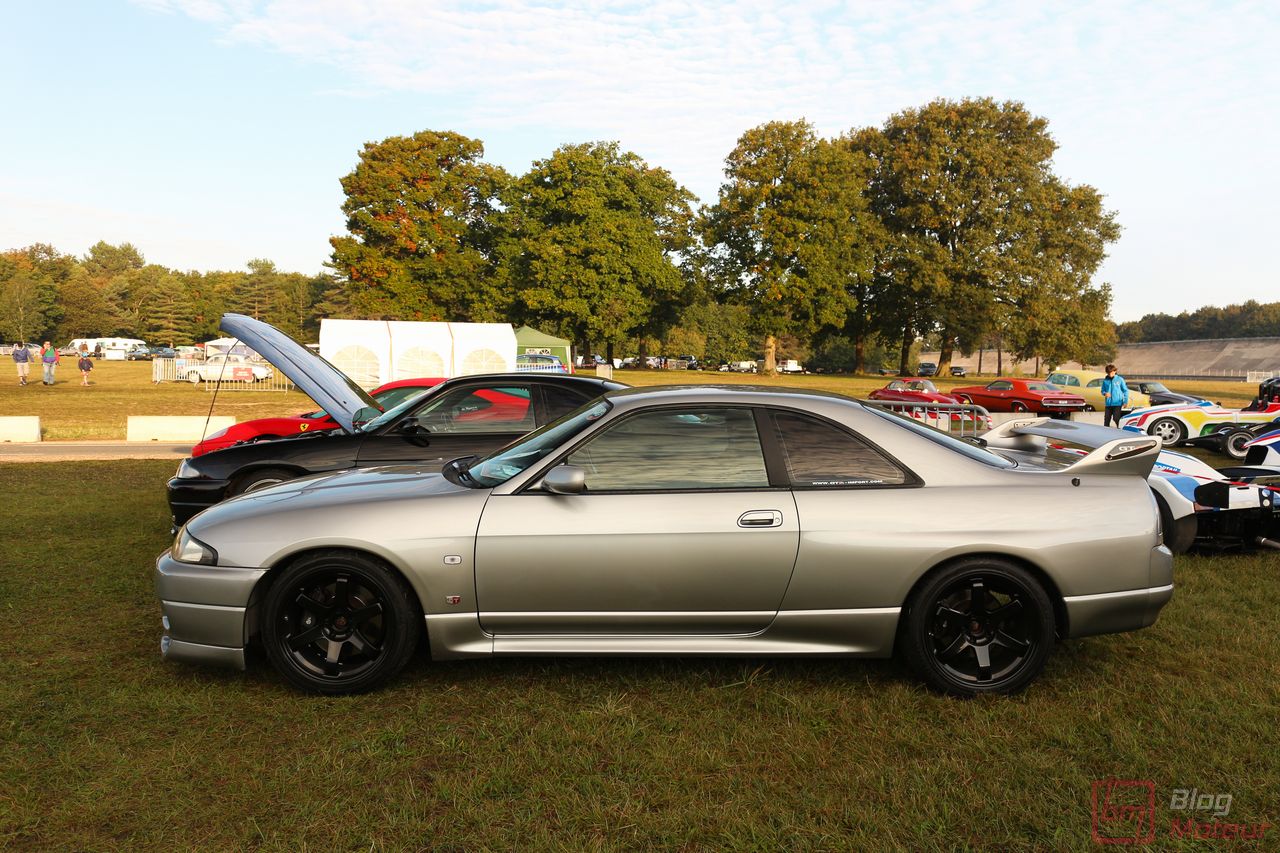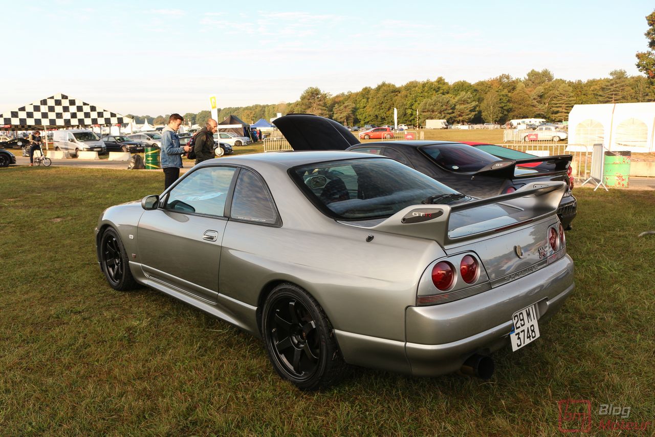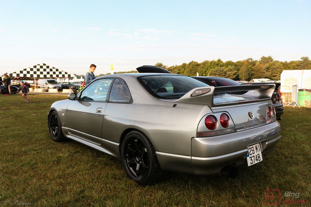 Faisons un zoom sur deux rares (en France) Nissan Skyline R33 GT-R ! La grise est une phase 3 de 1997, la noire une phase 1 V-spec à moteur forgé. 2708 exemplaires de phase 3 sur 16 250 GT-R produites … cette belle grise serait une des six seules françaises ! Officiellement bridée au Japon à 280 ch, avec un moteur naturellement « généreux », l’auto approcherait plutôt les 380 ch, libérés avec fougue de son six-cylindres biturbo et canalisés par quatre roues motrices et directrices ! Si nos lecteurs fans de japonaises rêvent d’en voir plus, n’hésitez pas à nous le dire ; on est proches de l’affaire 🙂