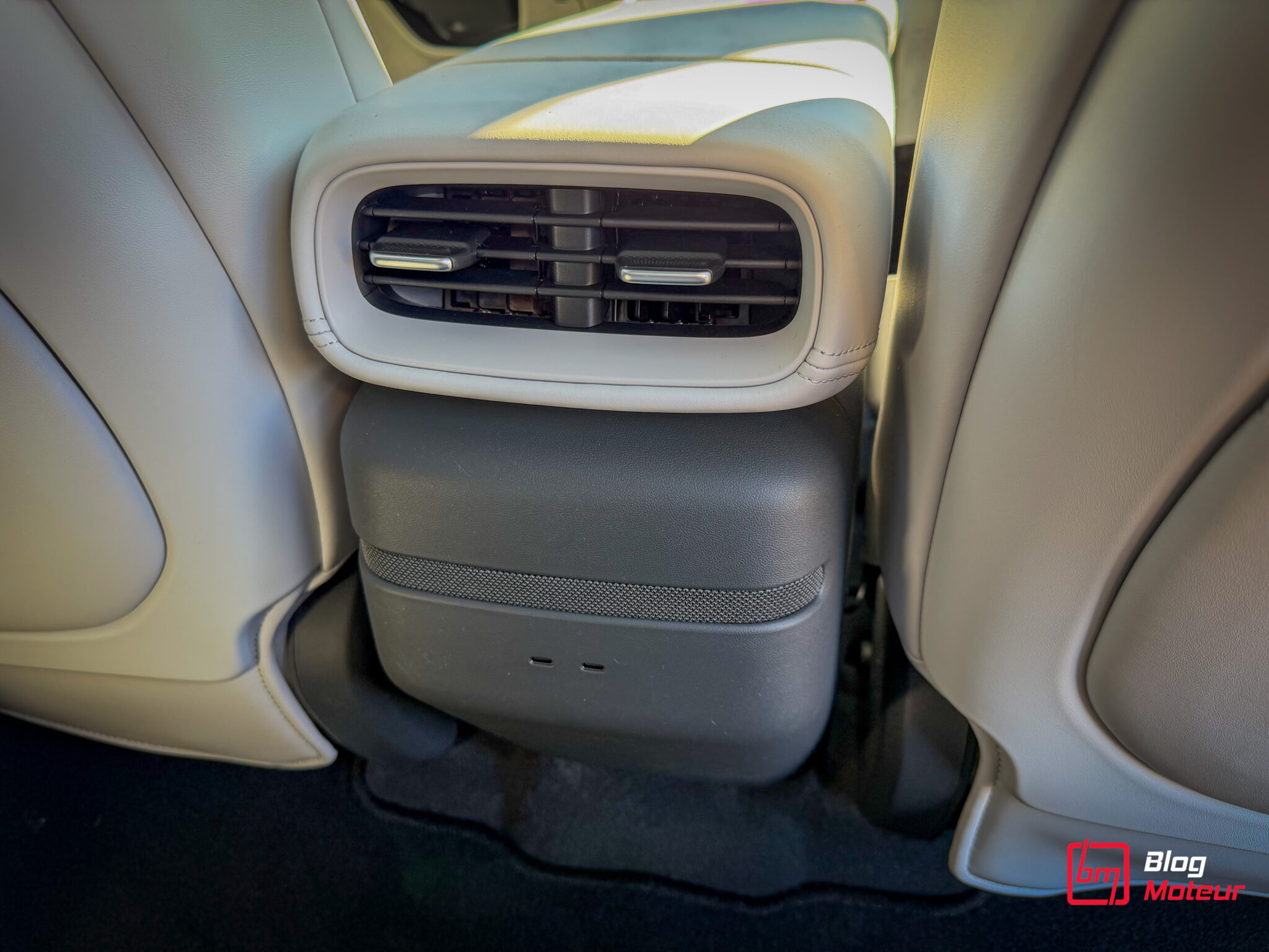 Le XPeng G6 choie ses occupants, et notamment à l’arrière : il y a de l’espace à revendre, et la banquette arrière offre un excellent sens de l’accueil, dans la plus pure tradition Chinoise. Le dossier est inclinable, et le confort offert est remarquable aux extrémités (c’est un peu moins vrai pour le passager du centre). Là encore, le soin apporté à la qualité de fabrication est à souligner, avec des contre-portes aussi soignés qu’à l’avant, des poches aumônières au dos des sièges, ou encore un large accoudoir.